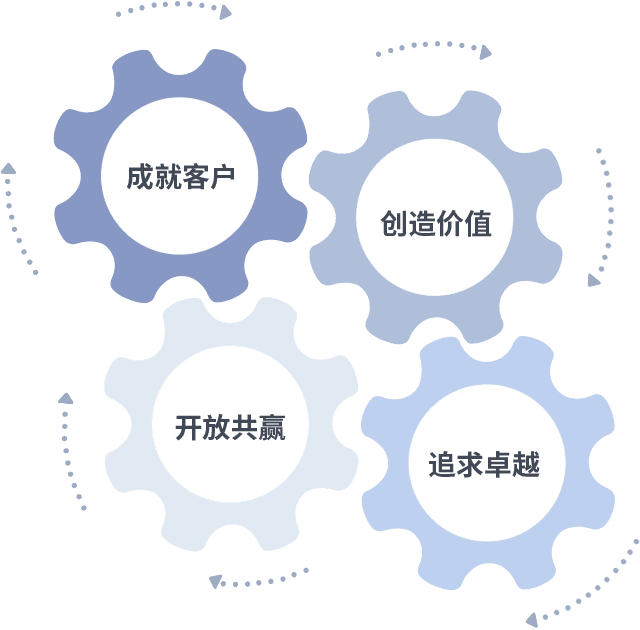成就客户是一切决策的出发点,,,,创造价值是衡量所有工作的标准,,,,追求卓越是我们做事做人的态度,,,,开放共赢是我们的格局也是最终的结果。。。。价值观的齿轮环环相扣,,,,推动着组织里的每个人不断向前。。。